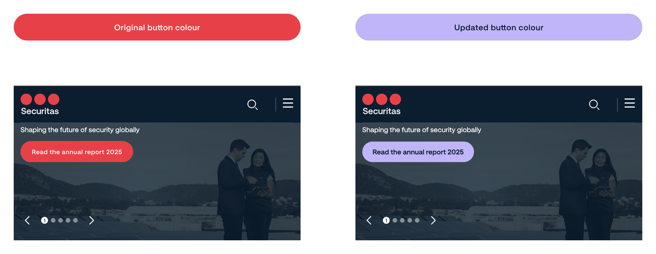 The color scheme update was part of this. The existing palette had inconsistencies that failed contrast requirements in several contexts. The new system was built to pass at every level, while still feeling like Securitas — not a compliance retrofit, but a refinement that respected the brand.